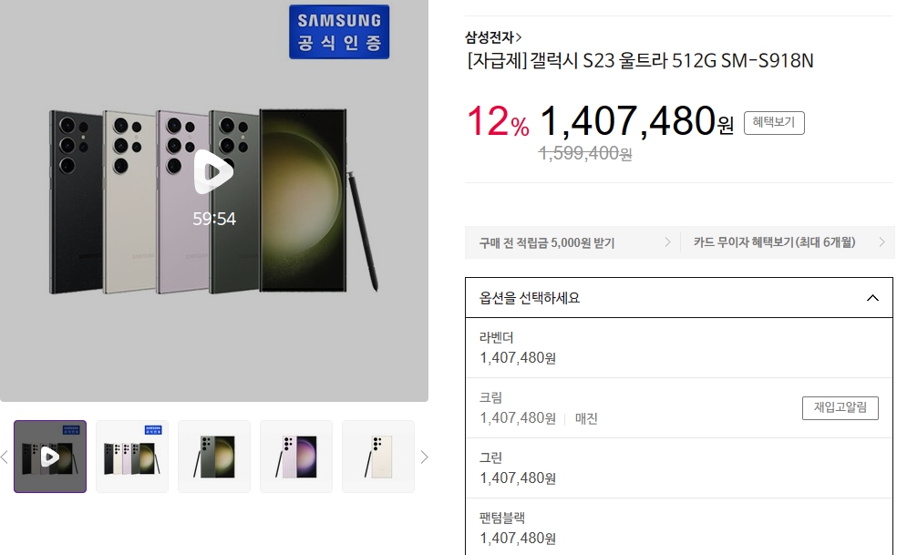 그럼 S23울트라 256GB 출고가는 159만 9400원인데요.