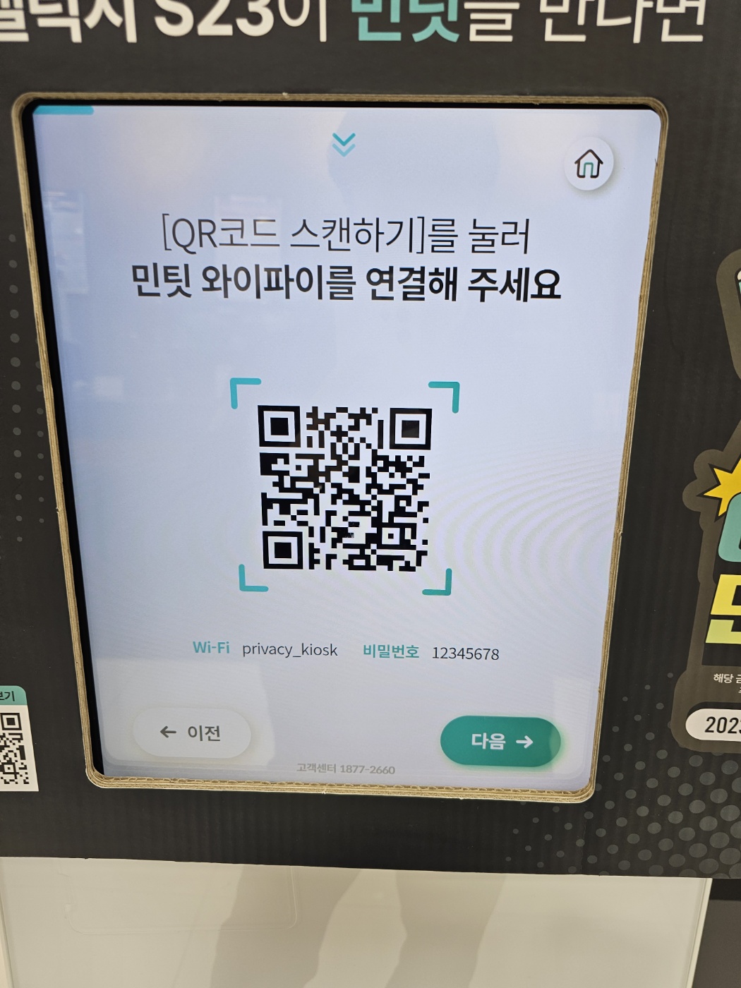 QR코드를 찍고 민팃 판매용 와이파이에 연결해 줍니다. 화면에 보시면 비밀번호가 뜨죠?
