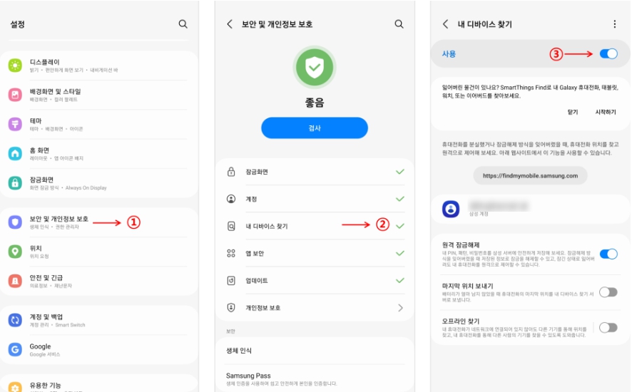 분실하기 전에 미리 설정하시고 삼성계정 또한 아