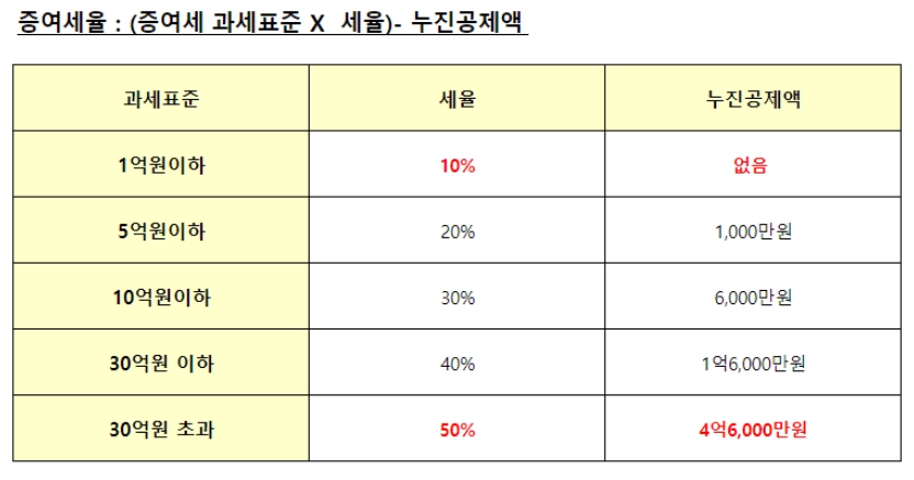 위 공제금액을 넘어선 금액에 대해 위 표와 같이 증여세를 책정하여 세금을 지불하게 됩니다.