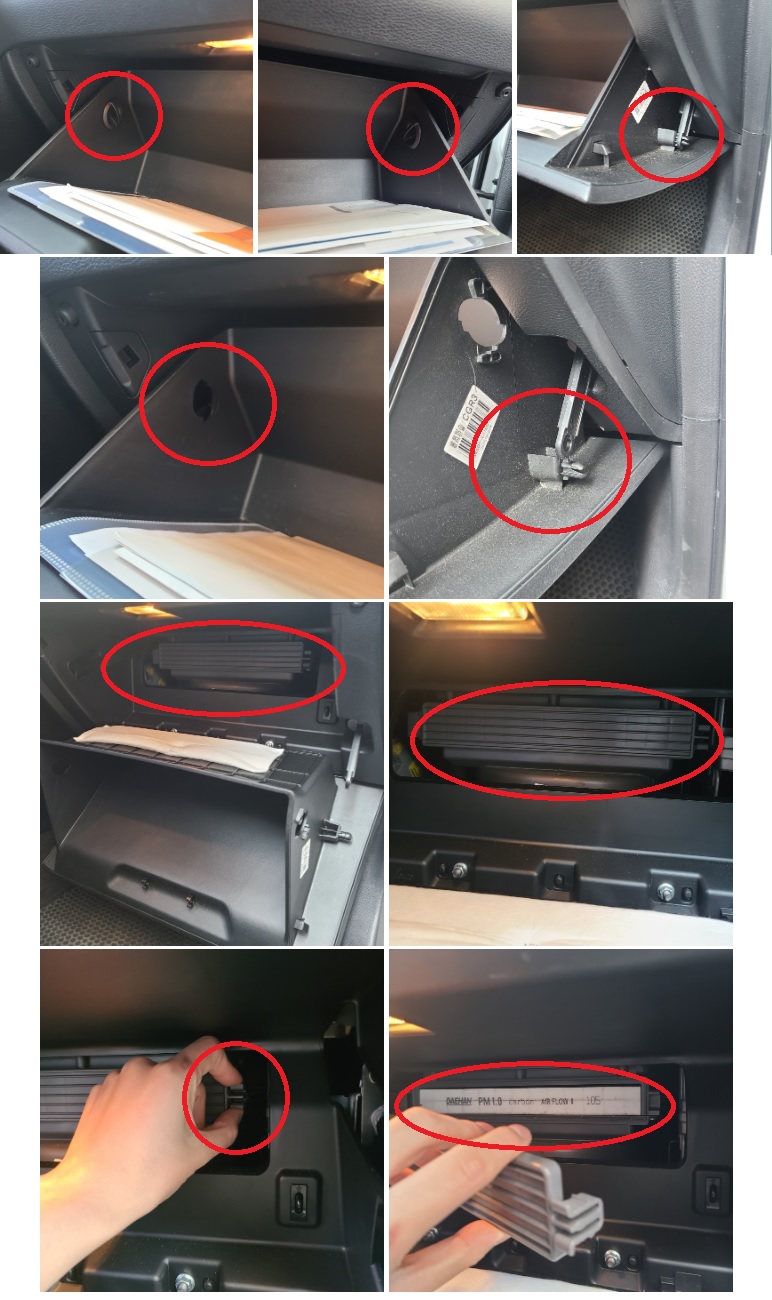 첫 번째로 조수석 하단의 글로브박스를 열어주시고, 안쪽의 좌측과 우측에 고정된 핀을 제거 한 뒤