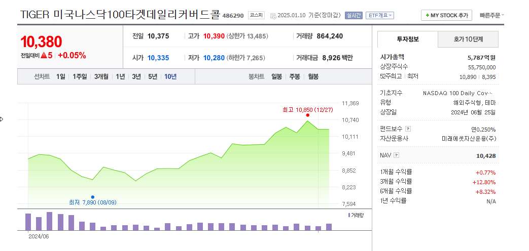 요즘 제가 투자하고 있는 분배금이 나오는 TIGER 미국나스닥100타겟데일리커버드콜 주식을 알아봅시다.