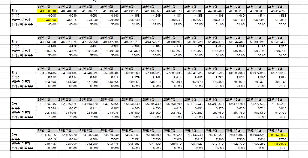 1년뒤 보유주식수는 대략 4569주가 되고, 월 분배금은 60만원을 넘게됩니다. 딱 4000만원 만 투자후 분배금으로만